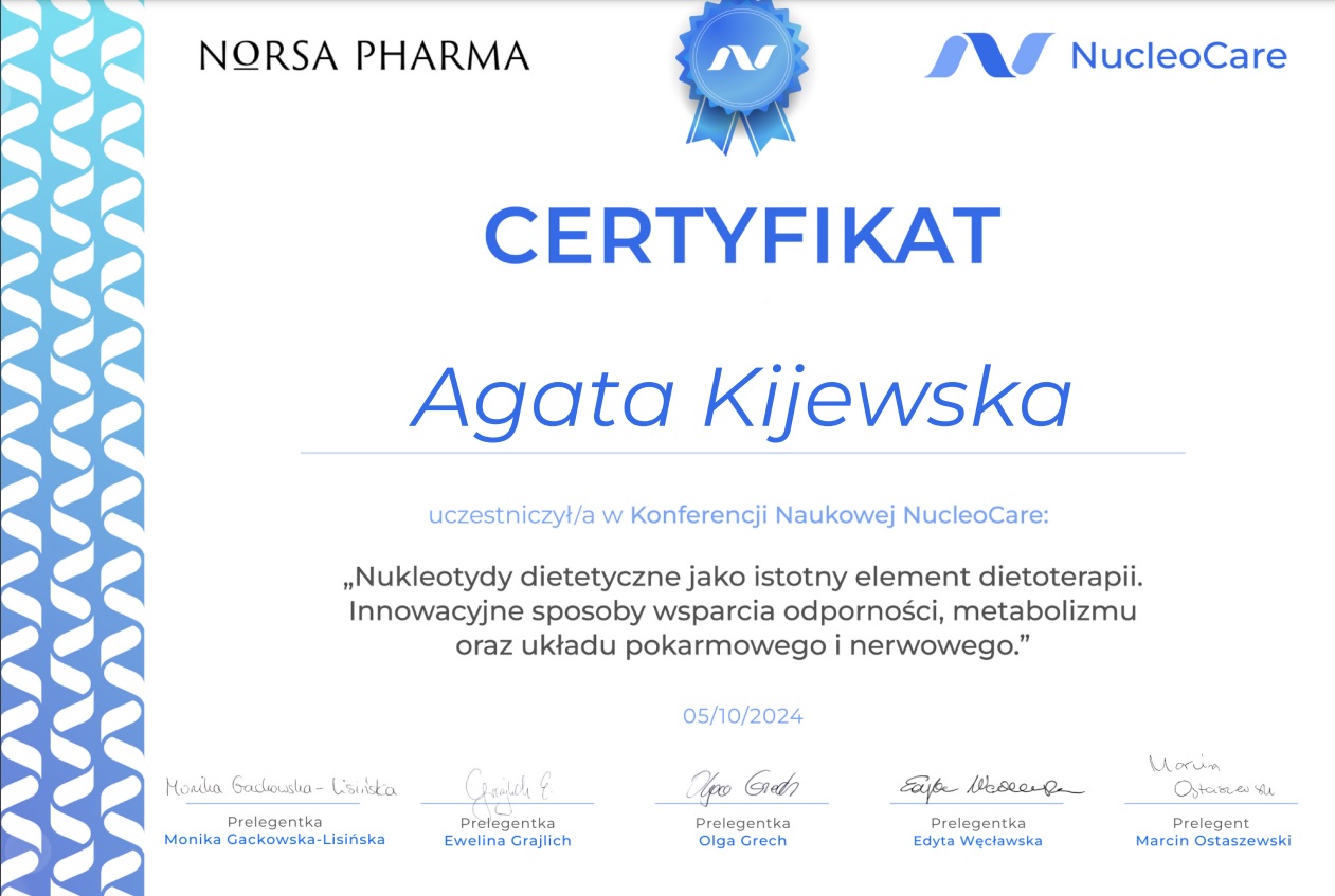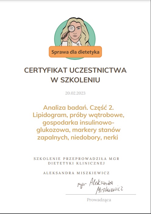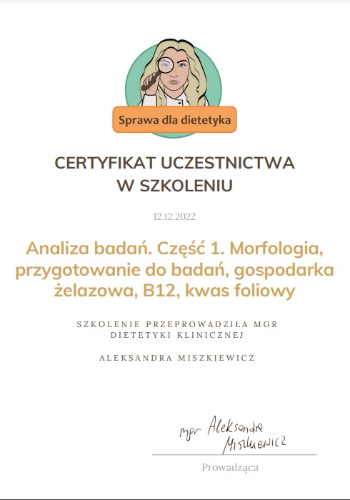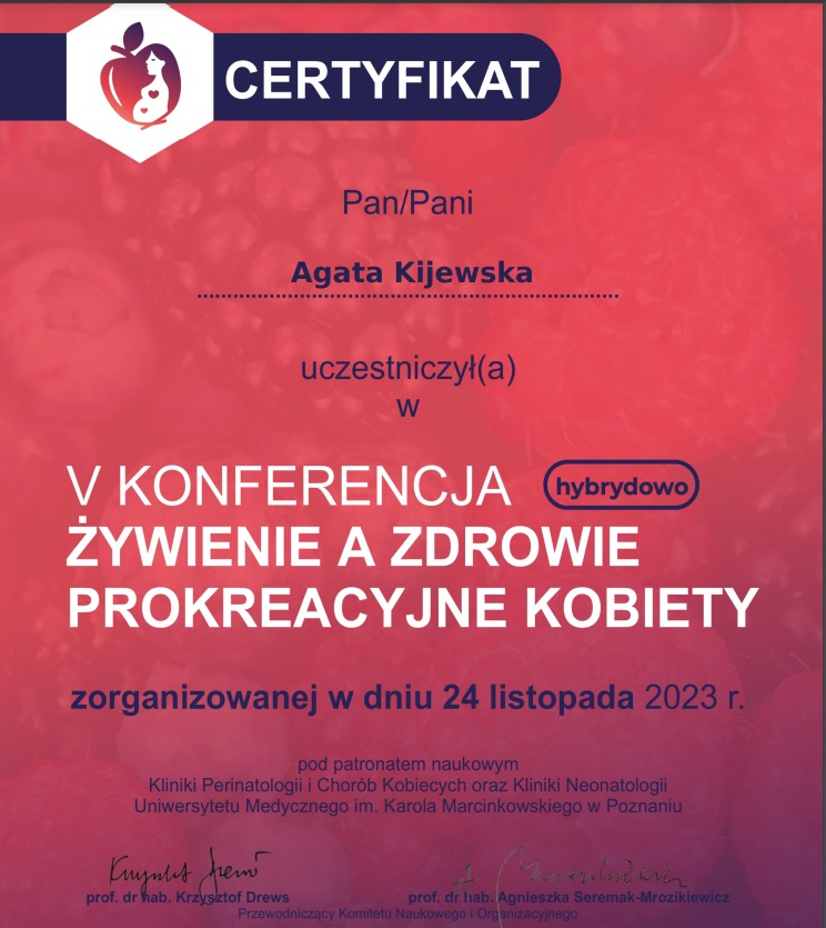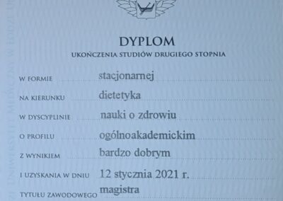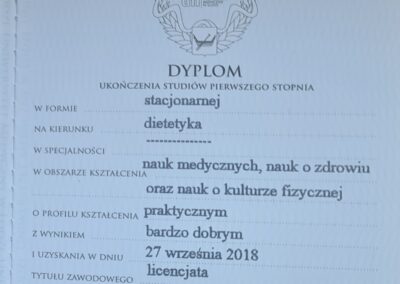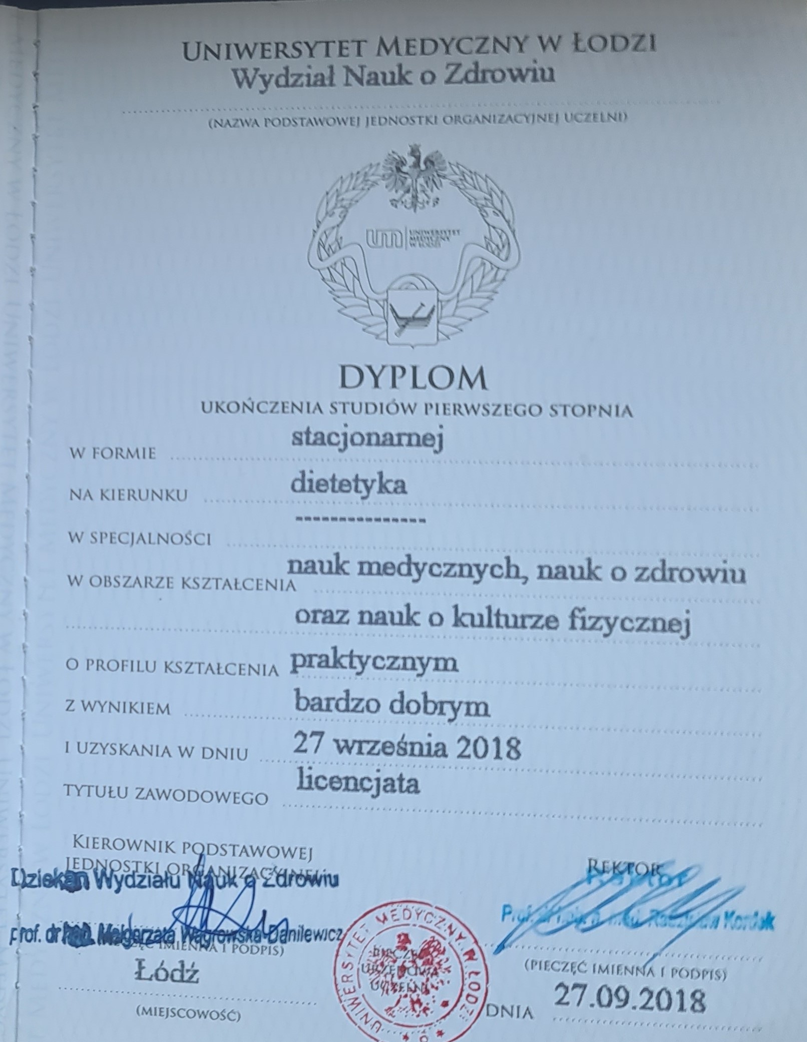 i jestem dyplomowanym dietetykiem klinicznym. Ukończyłam Uniwersytet Medyczny w Łodzi (studia zarówno I, jak i II stopnia). Moją specjalizacją, ale także ogromną pasją jest dietoterapia w zaburzeniach układu hormonalnego: PCOS, niepłodności oraz chorób endokrynnych, takich jak niedoczynność tarczycy i Hashimoto. W gabinecie skupiam się na kompleksowej opiece i diecie dla wsparcia płodności zarówno kobiet, jak i mężczyzn, aby spełnić ich marzenia o byciu rodzicem (starania naturalne, in vitro, prewencja poronień). Duże grono moich pacjentów to również osoby z problemami skórnymi, z którymi pracujemy nad znalezieniem i zaadresowaniem przyczyn trądziku.