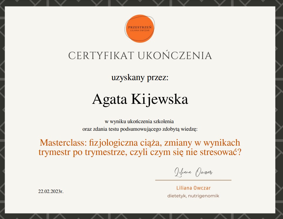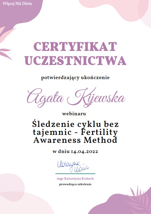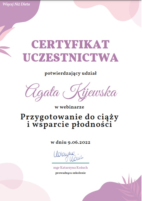 Dodatkowo możesz znaleźć mnie na facebooku i instagramie, gdzie na co dzień pokazuję wyniki moich podopiecznych, edukuję w zakresie płodności i pokazuje jak ja żyję w zgodzie z hormonami. Prywatnie jestem miłośniczką wszystkiego co greckie (co mogłaś zauważyć już po moim logo z oliwką :), a od dziecka jestem związana ze sportem, przez blisko 10 lat trenowałam taniec sportowy, moje obecne treningi składają się w dużej mierze z ćwiczeń wzmacniająco-rozciągających skoncentrowanych na pogłębianiu elastyczności oraz relaksacji organizmu, stąd też liczne zdjęcia w tematyce stretchingowej na moim profilu 🙂