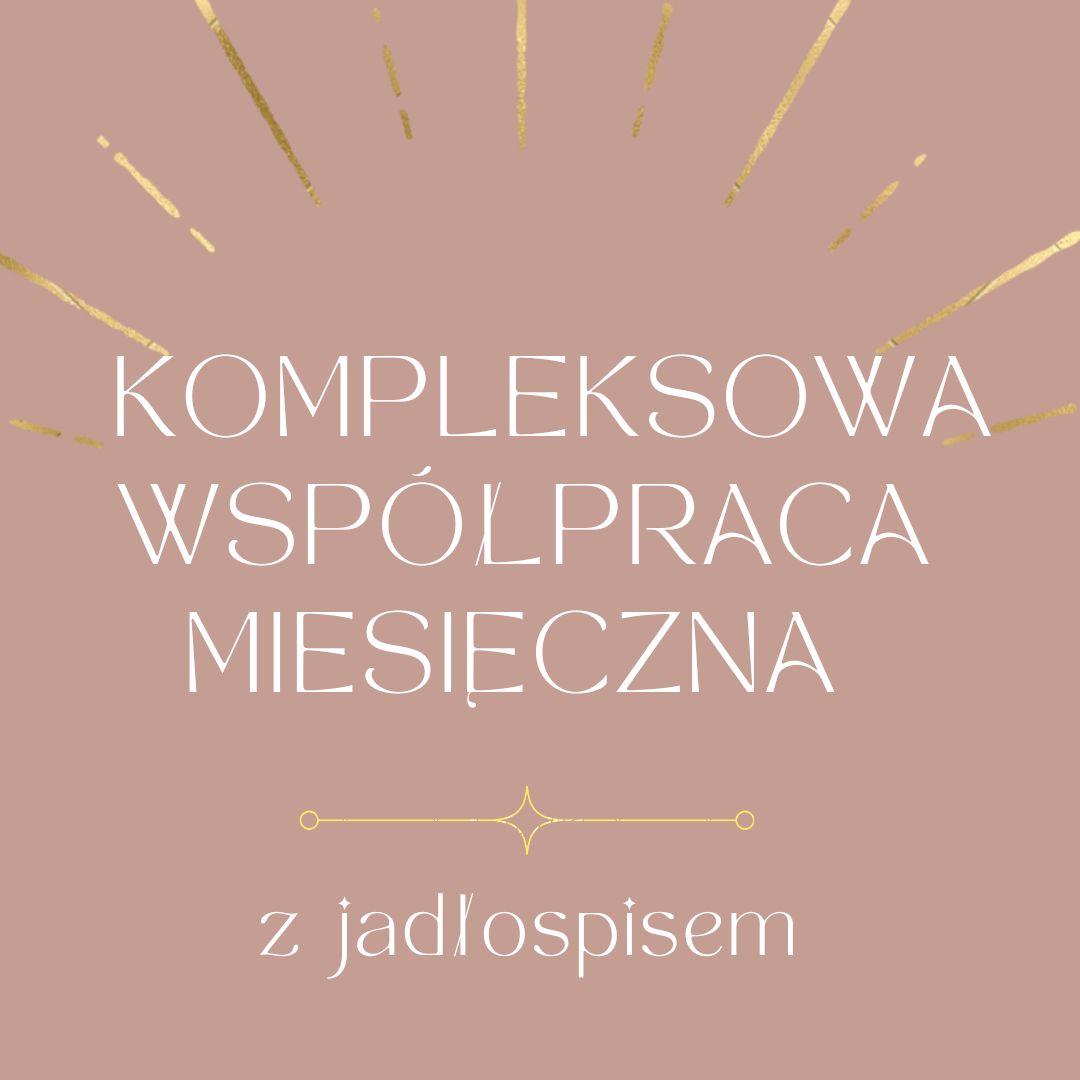 Pakiet kompleksowej współpracy to najlepsza opcja dla osób potrzebujących maksymalnej opieki i znalezienia przyczyny swoich dolegliwości krok po kroku aby dojść do swojego celu.  Dodatkowo w pakiecie otrzymujesz indywidualny jadłospis z posiłkami dostosowanymi pod Twoje potrzeby i problemy zdrowotne wraz z wliczonymi modyfikacjami i zamiennikami w ciągu miesiąca, aby zachować różnorodność w swojej diecie.